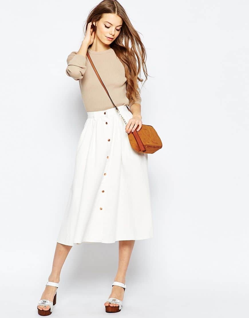 Романтический образ мы получим, сочетав юбку миди ниже колен с кофтой с длинным рукавом. Дополнят уместно ваш наряд сумочка, а обувь подбирайте относительно погоды, сапоги или босоножки.