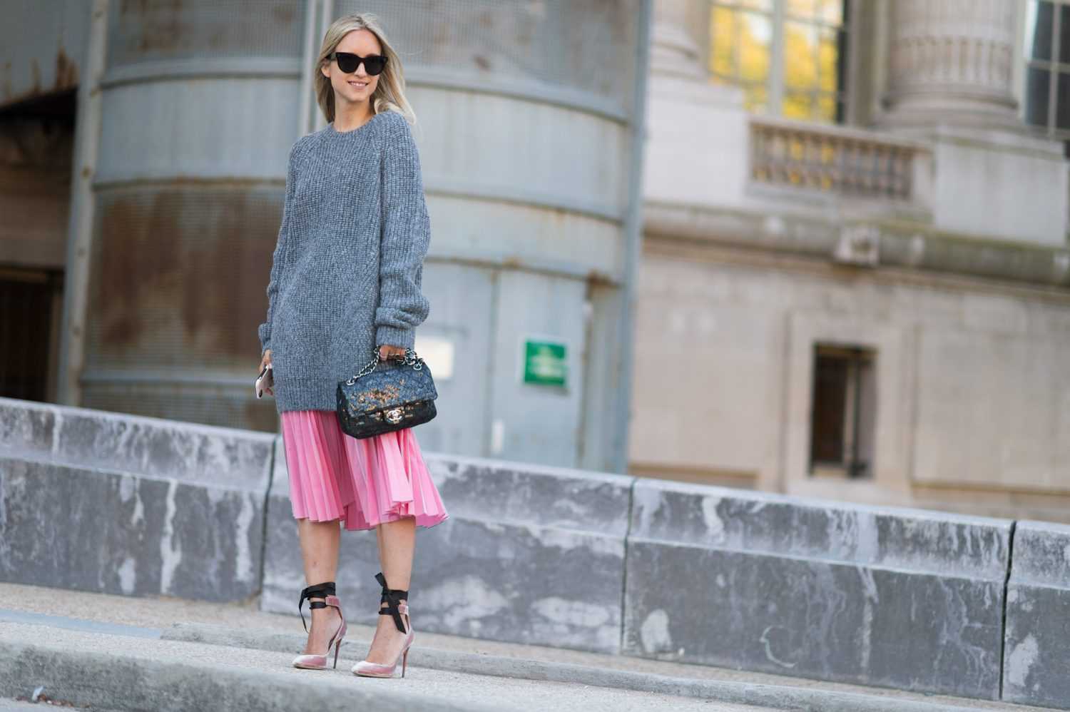 Блогер Leonie Hanne стильно сочетает серые и голубые тона. Босоножки на высоком каблуке говорят о том, что любой тип обуви отлично сочетается с плиссированной юбкой.