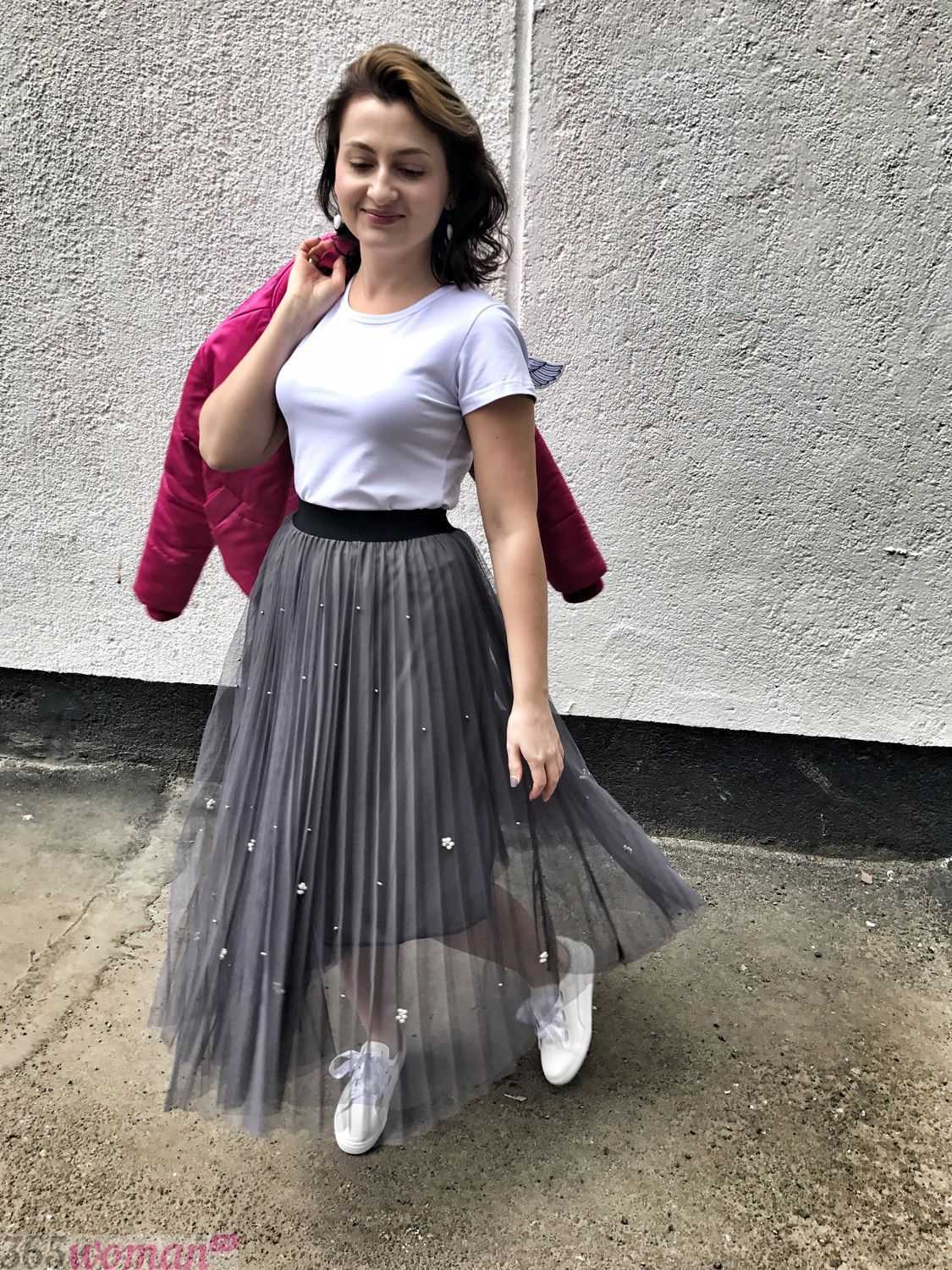 Со спортивной обувью можно сочетать почти все фасоны юбок, важно только правильно подбирать фактуру, цвет, модель обуви: