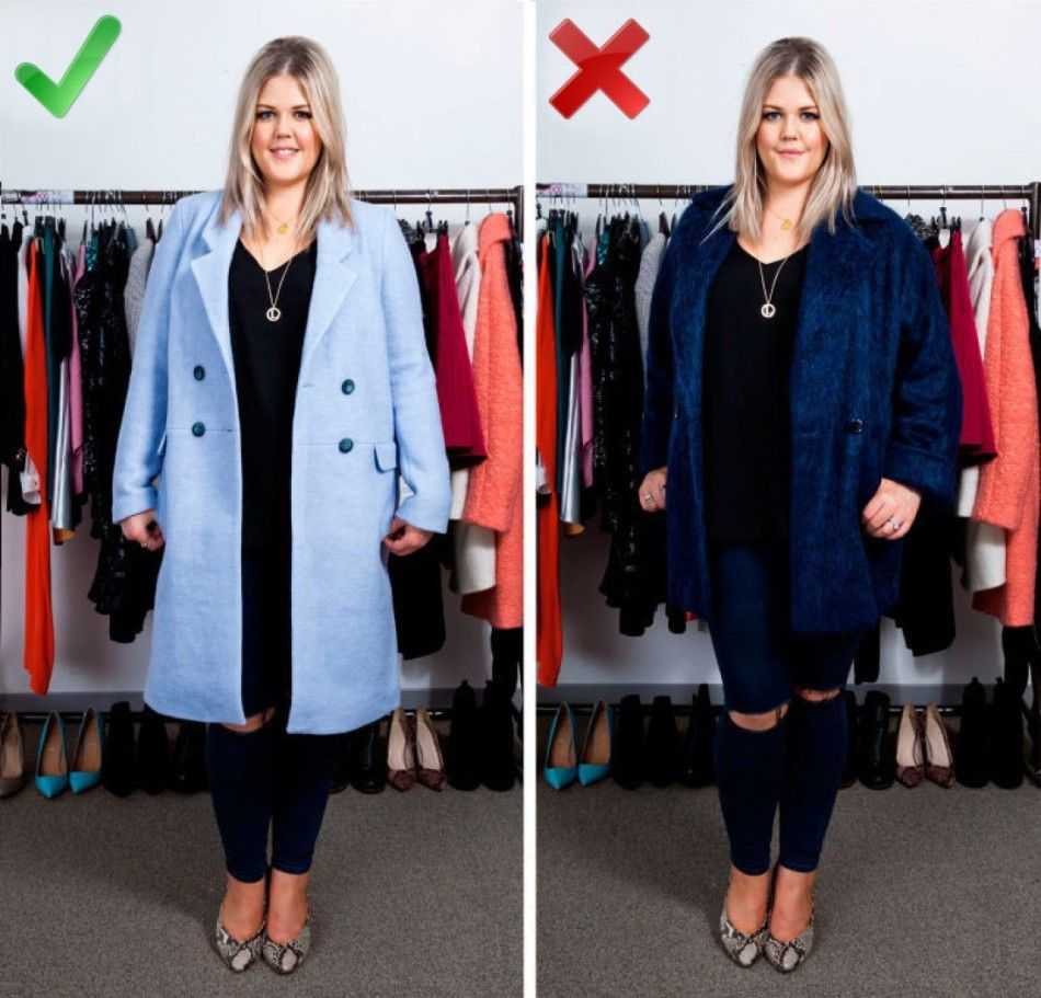 - Отказываемся и от излишне свободных балахонистых моделей. Оптимальный вариант — прямой силуэт или кокон.