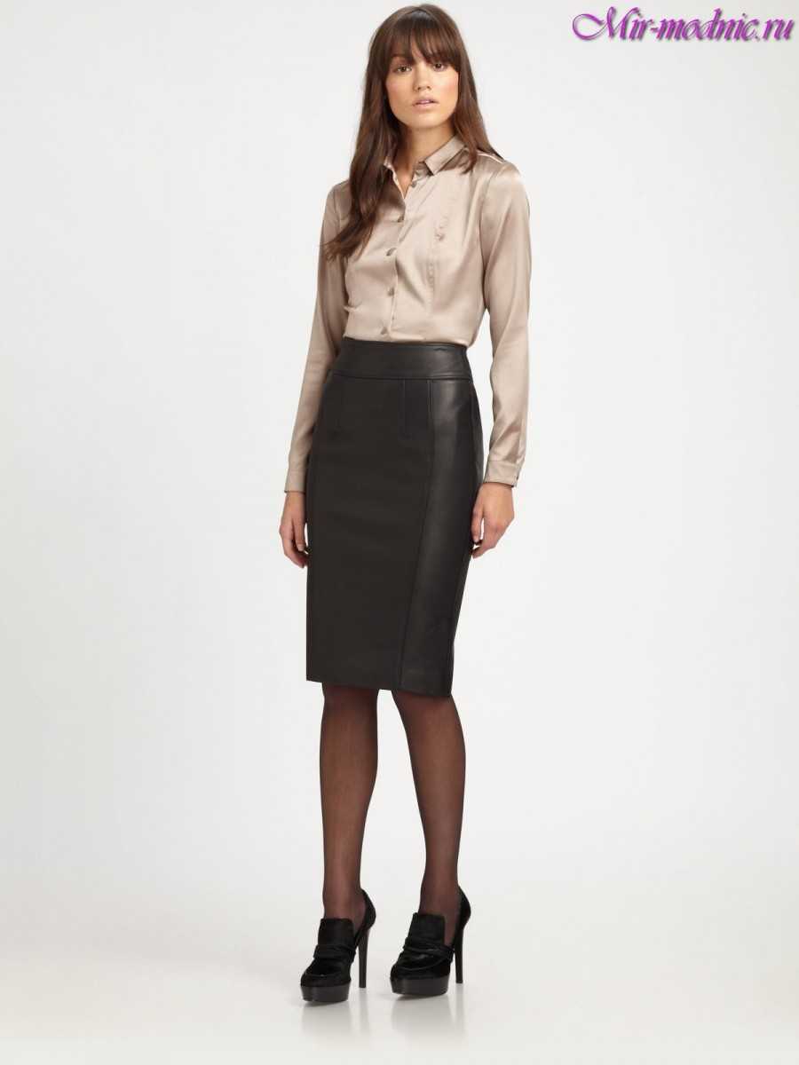 Кожаная юбка-карандаш бежевого цвета хорошо комбинируется с белым, черным и бежевым верхом. Здесь допустимо подбирать верх с декором или из вязаного материала. Аксессуары можно подбирать в тон юбке, а украшения золотого оттенка. Если выбираете верх темного цвета, то цвет обуви должен ему соответствовать.