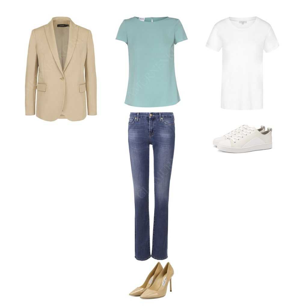 Однако, завершальный вариант уместен будет только в летний период. Вариант лука с джинсами: зауженные джинсы традиционного синего цвета, белый топ с бежевой отделкой сверху, кремовый вязаный кардиган. К этому ансамблю идеально подходят бежевые ботильоны
