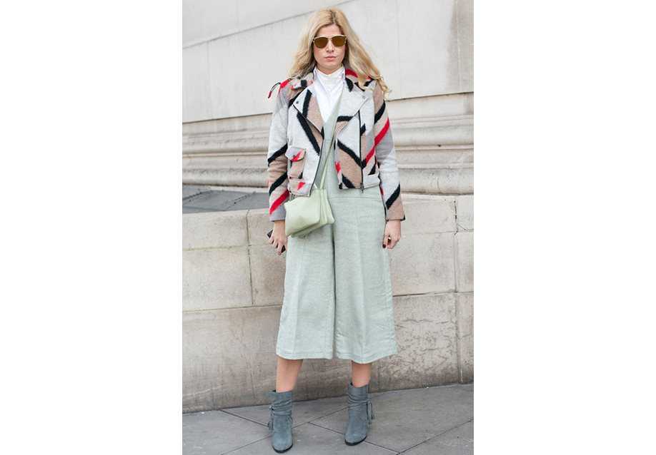 Неприхотливые модные кюлоты хорошо комбинируются с удлиненными блейзерами, свитшотами, топами в бельевом стиле, пуловерами и меховыми жакетами. Обувать можно все что угодно – грубые ботинки в милитари-стиле, аккуратные туфли, босоножки на шпильке или сандалии на массивном каблуке.