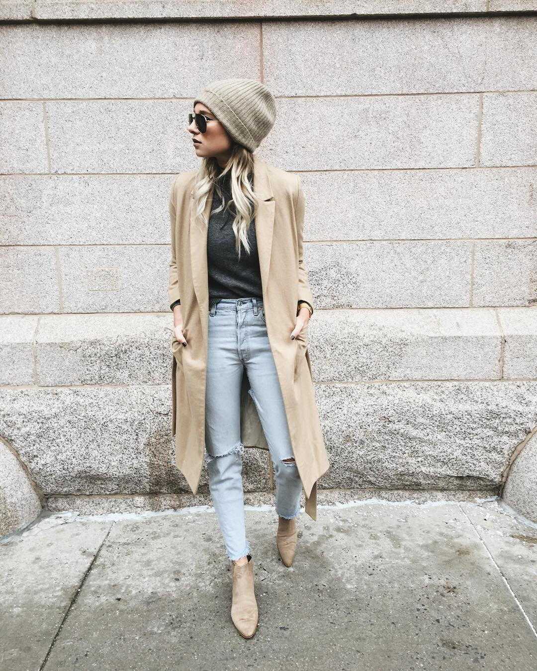 В весенне-осенний период носим скинни с удлиненным пальто. В более теплое время года меняем пальто на тренч. В сочетании с объемным верхом скинни выглядят вполне модно и современно. Дорабатываем образ актуальными аксессуарами и обувью.