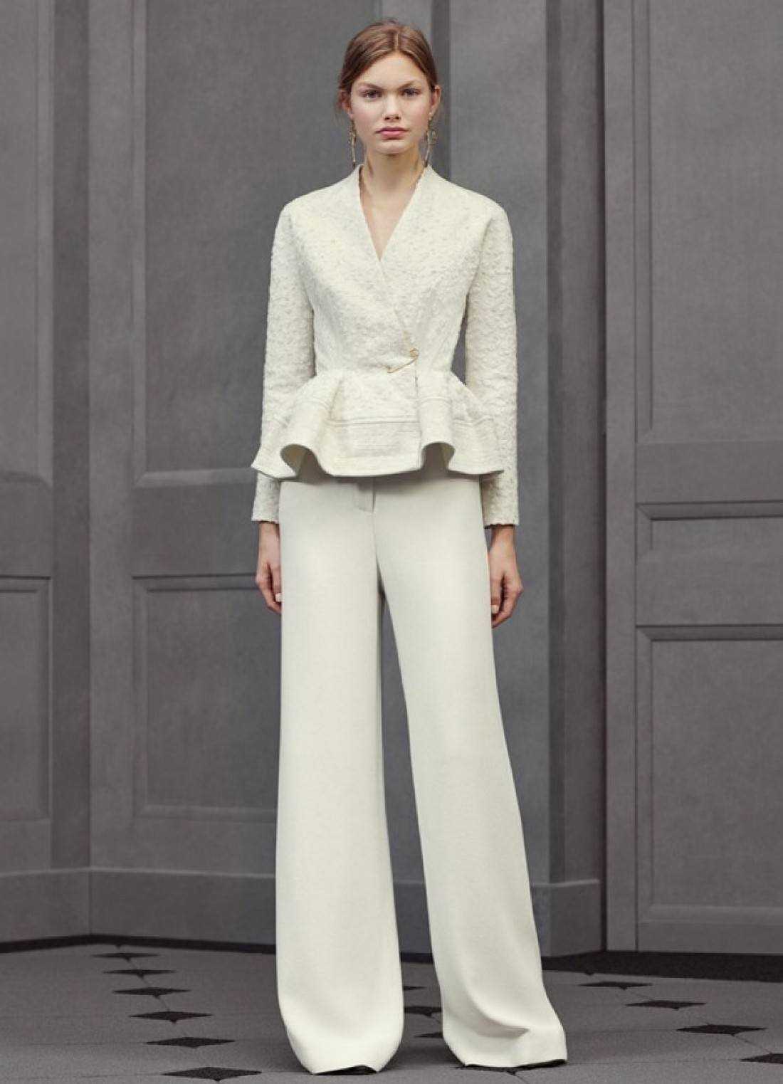 Костюм с широкими брюками – своеобразный отсыл в мужской стиль, который все чаще преобладает в современных женских образах. Носить такие брюки нужно с укороченными жакетами, шифоновыми блузами с кружевным воротником, бантами, манишкой и другой роскошной отделкой.
