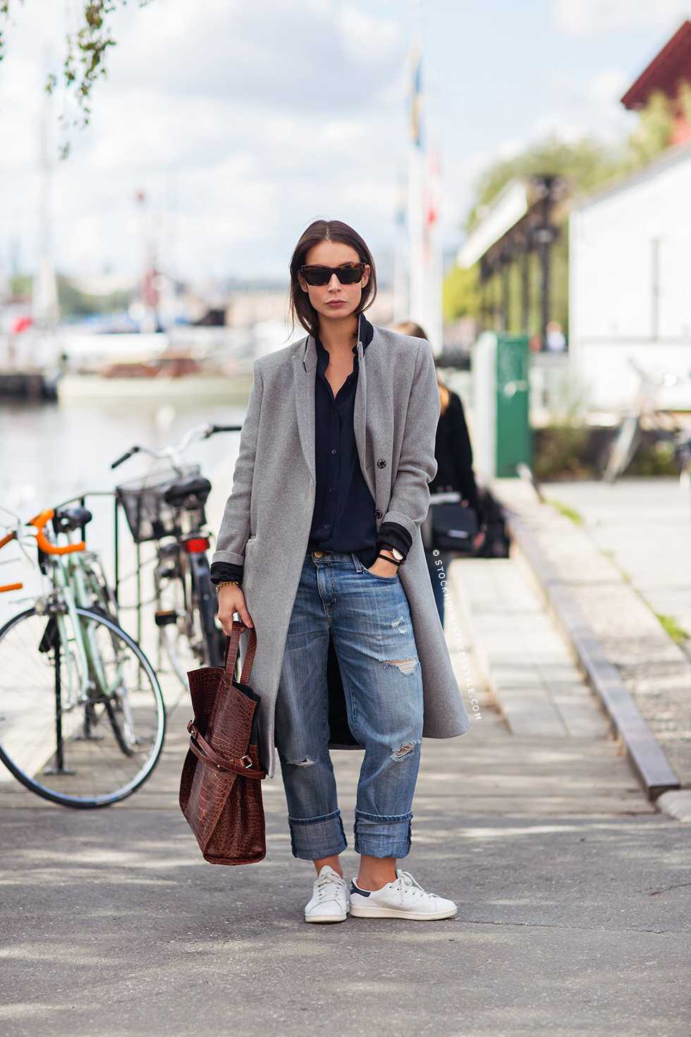 - Пальто с кроссовками и джинсами – беспроигрышный вариант, подчеркивающий свободу образа. Это могут быть модели скинни, классика, бойфренды, с подворотами снизу.