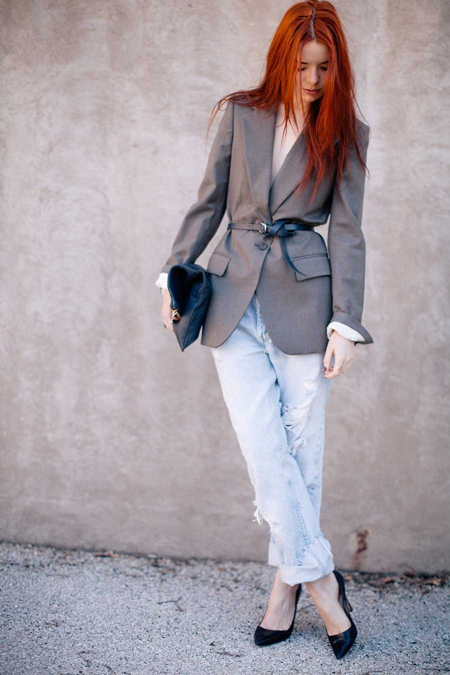 Есть вещи, в которые стоит вкладываться, а есть одежда, на покупку которой хватит минимальной суммы. Пиджак из тонкого кашемира – не самая бюджетная покупка, но очень практичная. Он стильный и красивый, хорошо согревает в холода, тактильно приятен и не потеряет своей актуальности несколько сезонов. Голубые джинсы и белую футболку отменного качества можно найти по разумным ценам.