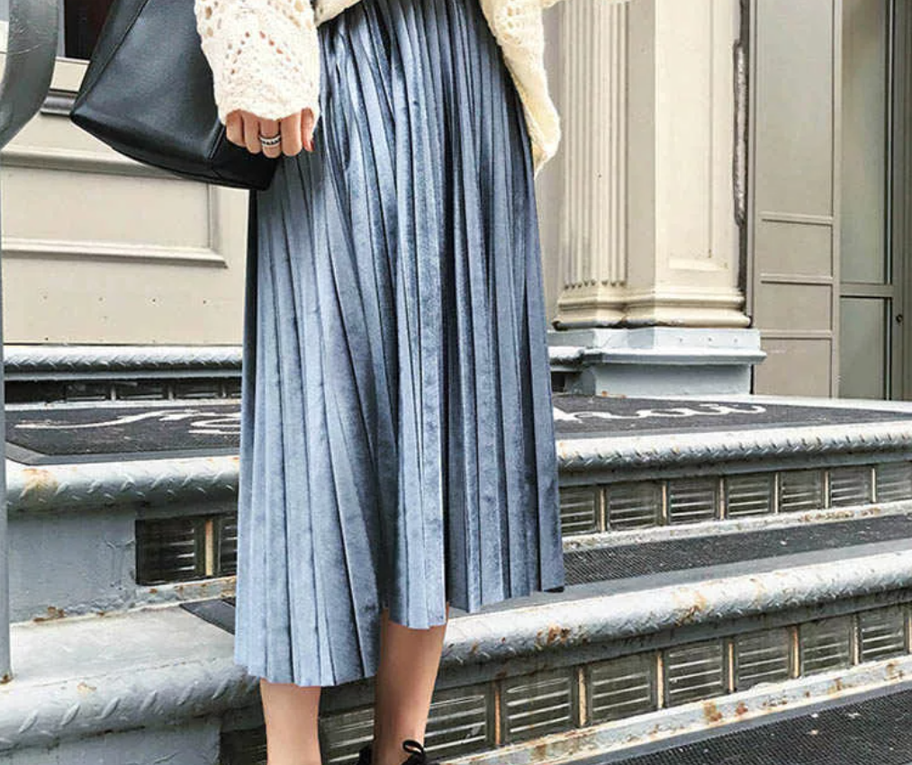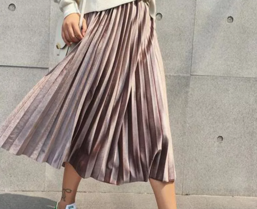 - плиссированные модели миди будут хорошо смотреться с кроссовками и кедами неярких цветов, а также туфлями на танкетке. Для осенних образов подойдут ботильоны.