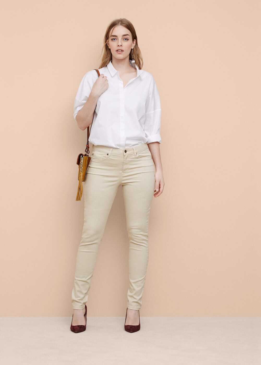 - Джинсы. Самый распространенный тип бежевых штанов. Встржюечаются зауженные, широкие, прямые фасоны, а также скинни, находящиеся в тренде уже не первый сезон.
