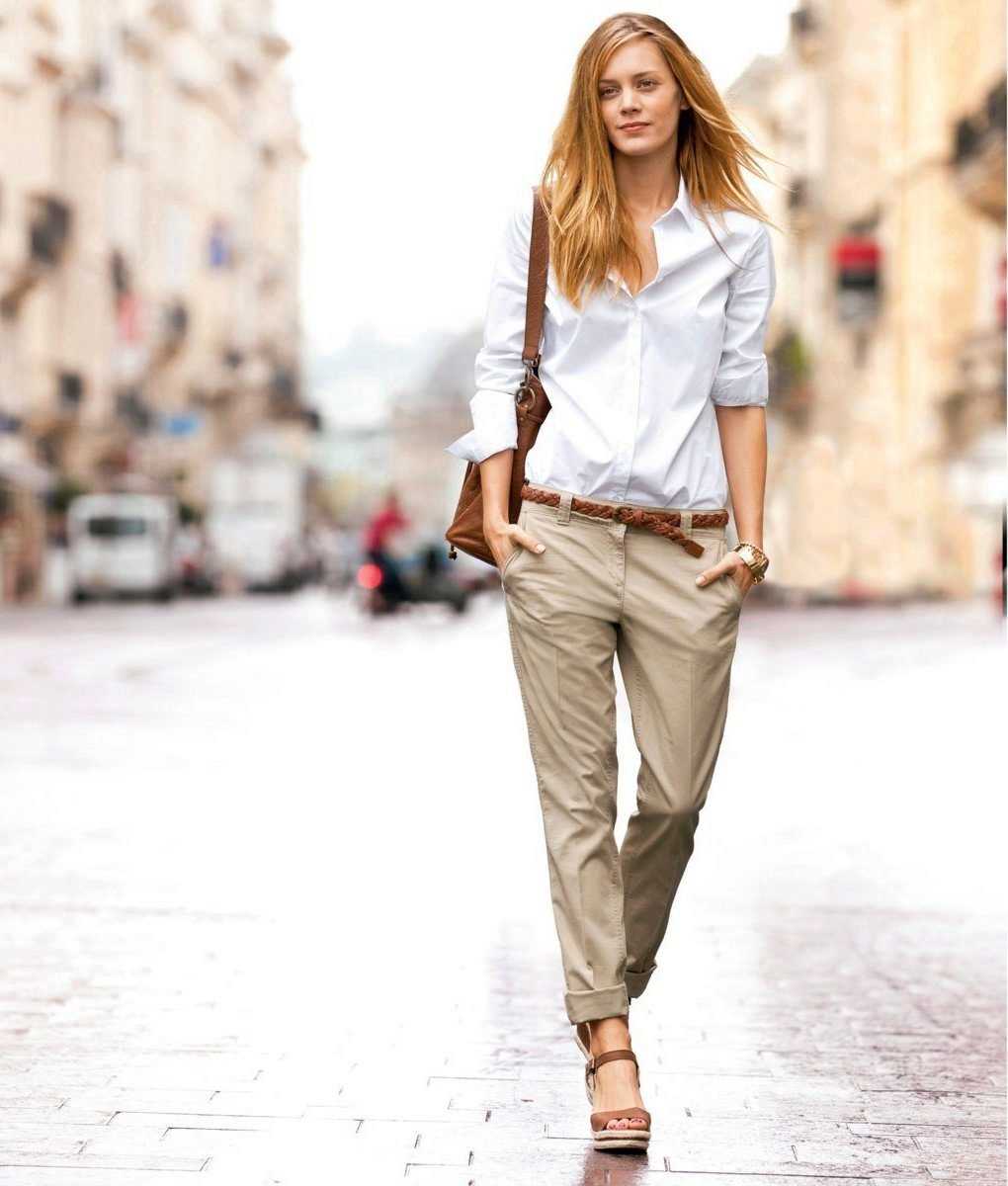 - Чиносы. Модели отлично корректируют несовершенства фигуры, поэтому подойдут девушкам или женщинам, которые стесняются носить светлую одежду. Такая вещь в песочном варианте особенно хорошо скрывает все недостатки.