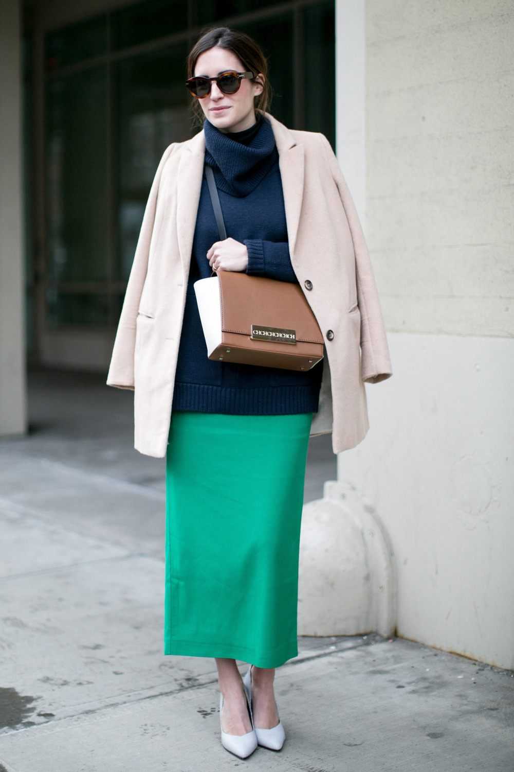 Ещё один вариант с юбкой-миди. Оттенок на этот раз ярче и светлее. Светло-зелёная юбка выигрывает от соседства с тёмно-синей водолазкой и нейтральным, бежевым пиджаком. Она становится центром образом, самым ярким его элементом.