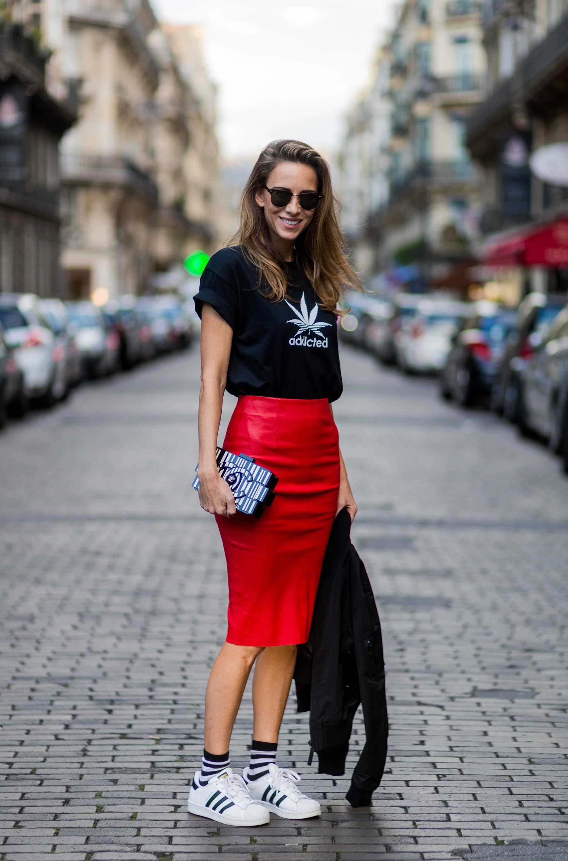 Короткая юбка хорошо сочетается с расстегнутым тренчем до колена и высокими сникерсами. Черные кроссовки сочетаются со светлым верхом, а белые кеды – с яркой юбкой.
