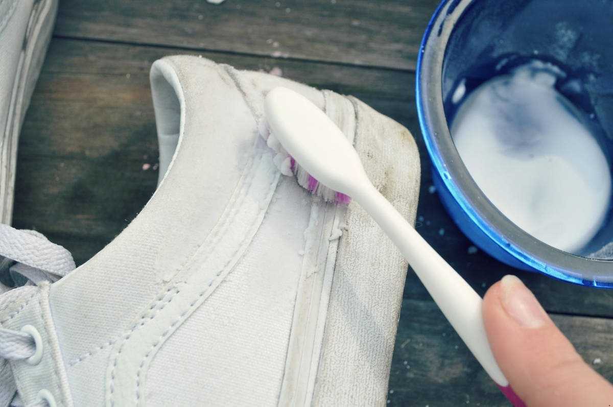 - Отлично удаляет грязь с белых кроссовок обычная отбеливающая зубная паста. Достаточно просто добавить в нее перекись водорода или лимонный сок и нанести смесь на пятна.
