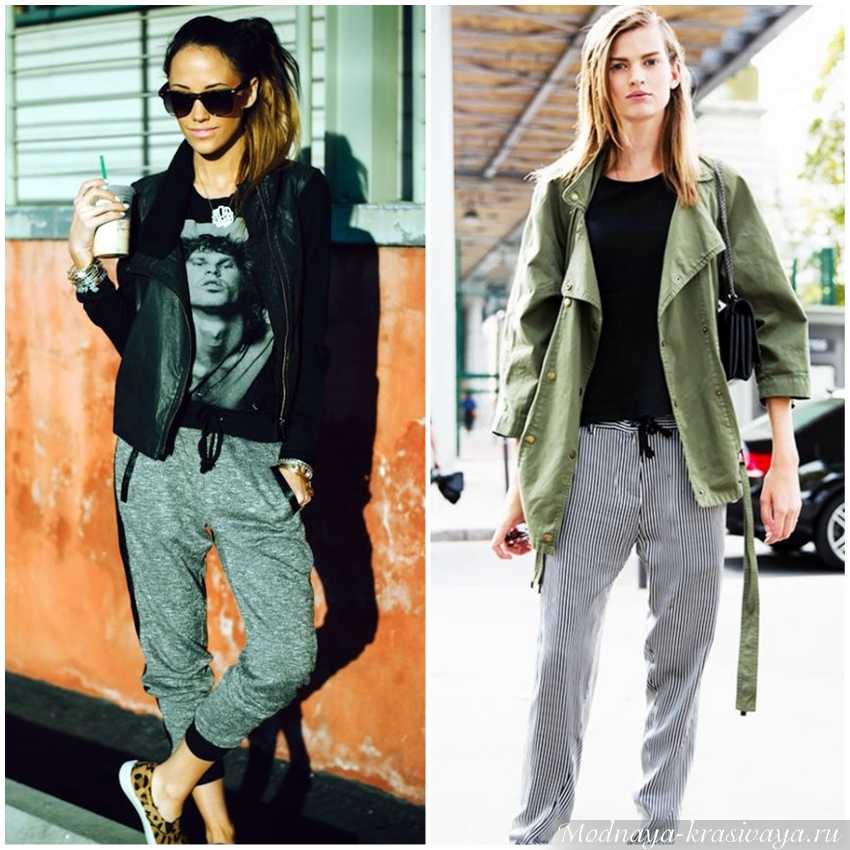 О декоре, вскользь мы уже говорили, однако отдельно хочется выделить лампасы. Лампасы это хорошо для тех, кто стесняется своих пышных бедер. Почему? Они визуально вытягивают фигуру. Носить брюки с лампасами лучше в сочетании с свитшотами, бомберами или со стегаными жилетками с капюшончиком. Не забываем, о моделях с карманами, модными в нынешнем сезоне.
