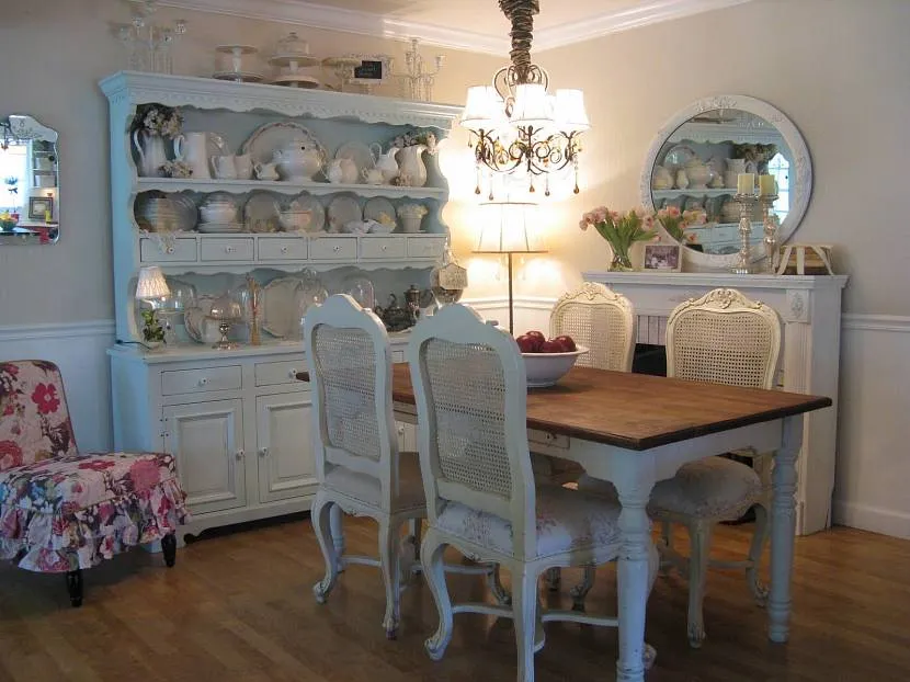 Интерьеры в стиле шебби-шик активно обставляются старой, потёртой, с облупившейся краской, как будто пропитанной историей мебелью. Попробуйте и вы скомбинировать старый белый буфет с современной кухонной атрибутикой из нержавеющей стали, и вы получите оригинальную кухню в стиле шебби-шик. Такой симбиоз сделает атмосферу в вашем доме ещё более непринужденной и расслабляющей.