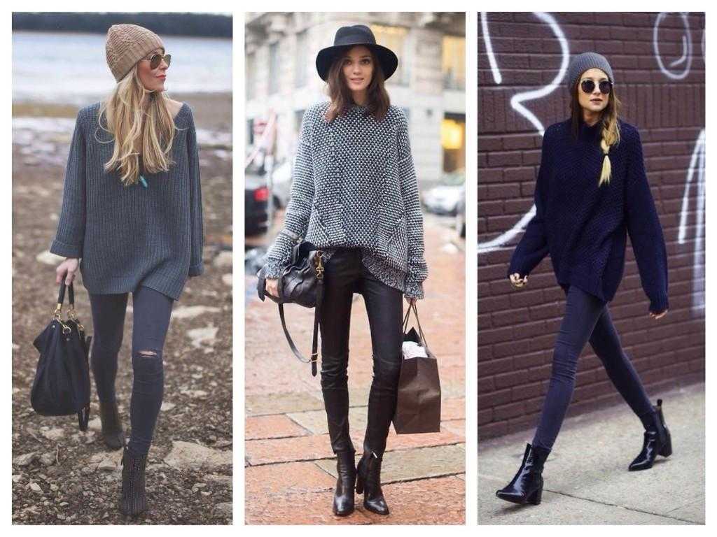 Одежда оверсайз в женском гардеробе включает объемный свитер или свитшот, которые можно носить с джинсами скинни, леггинсами.