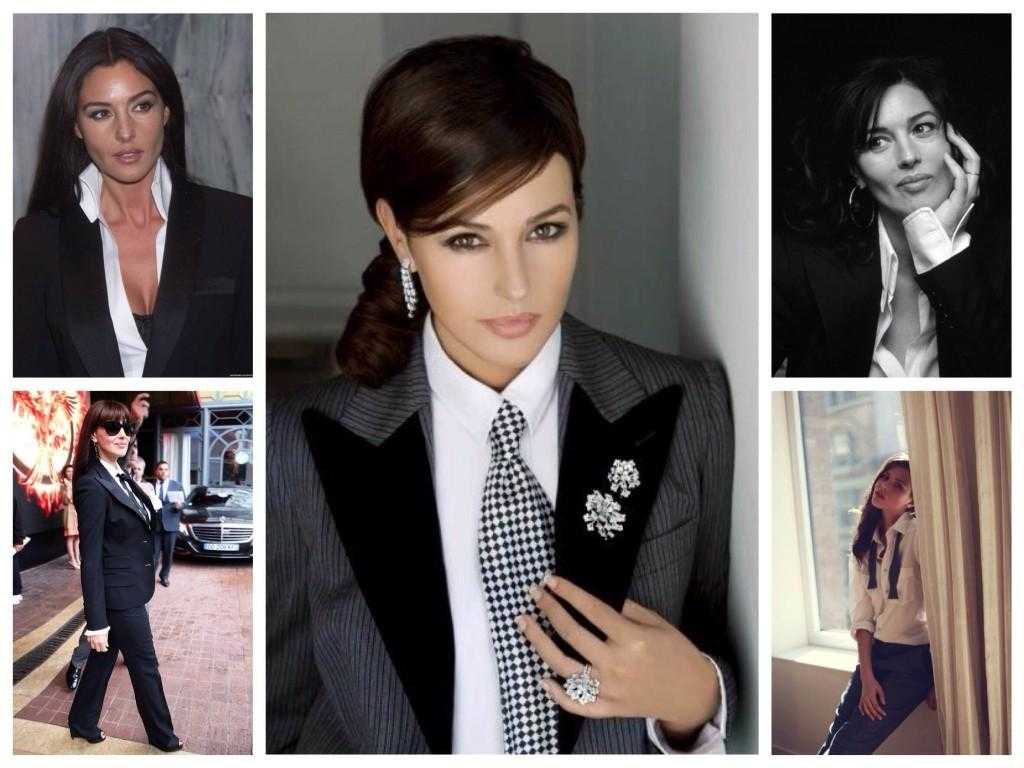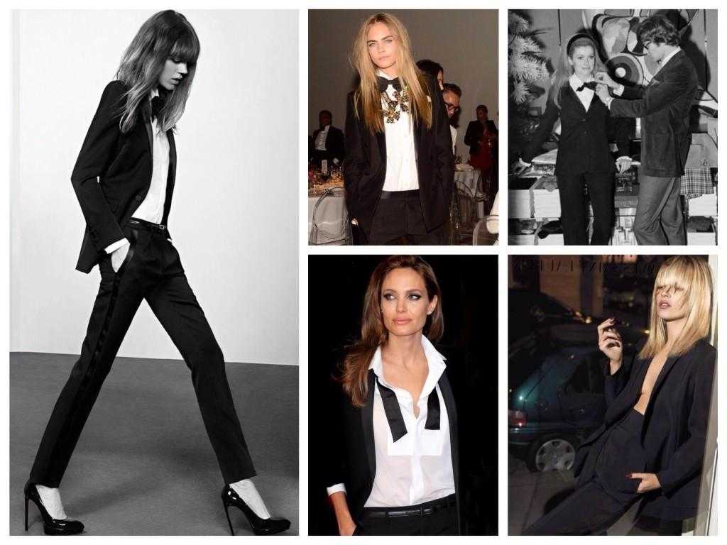 Смокинг ассоциируется с торжественным мероприятием и строгим дресс кодом. У женщин в гардеробе он появился благодаря Ив Сен-Лорану в 60-х годах и до сих пор актуален для торжественных выходов и городских образов у звезд Голливуда: Моники Беллуччи, Анджелины Джоли, Кейт Мосс.