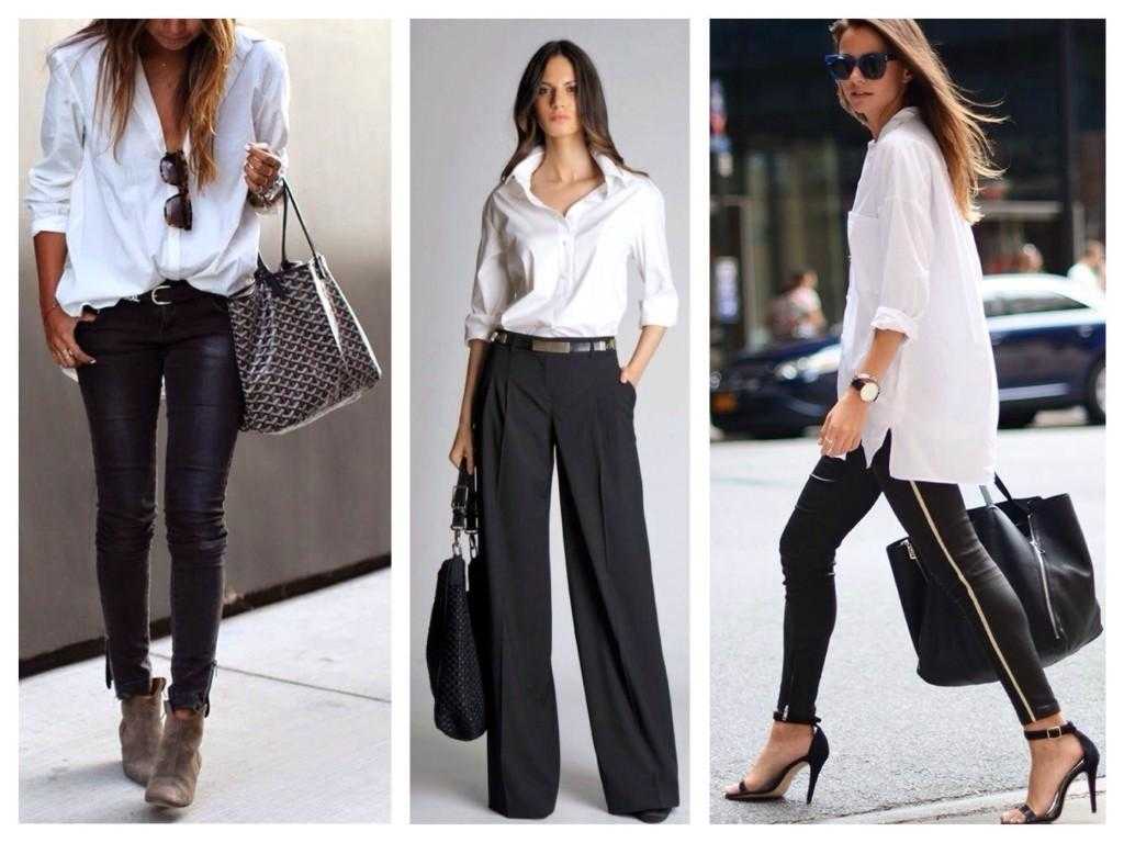 - если придерживаться монохромной гаммы, то можно заменять блузку на белую футболку и строгие брюки на джинсы тёмного оттенка;