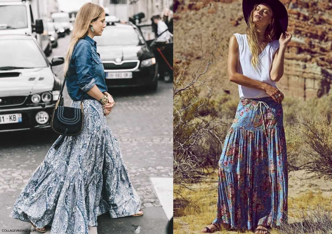 Наиболее актуальной длиной богемного шика остается макси. Юбки в пол на пике популярности уже много лет подряд. Цветочные или этнические мотивы, авангардные рисунки, клетка, животные принты — выбор достаточно велик. В таком наряде девушка будет выглядеть женственно, романтично и очень нежно.
