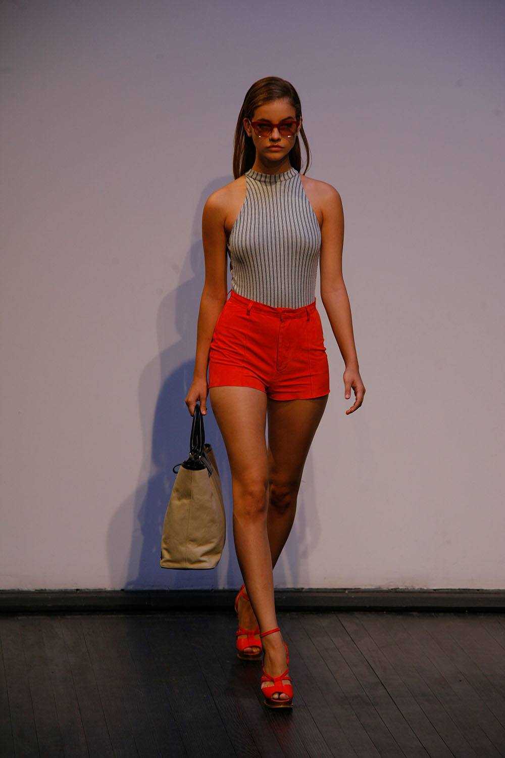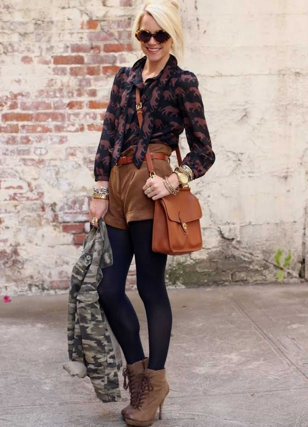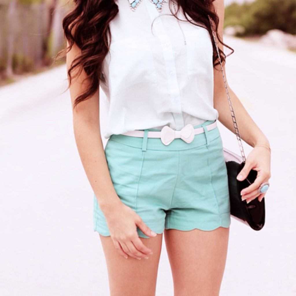 - С бермудами и шортами (белыми, бежевыми, оттенка неви или красными), объемной текстильной/кожаной сумкой и босоножками. Этот комплект отлично дополнят цепочки или серьги.