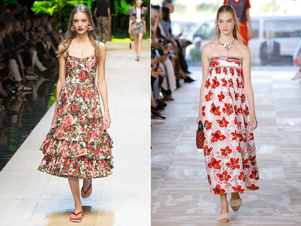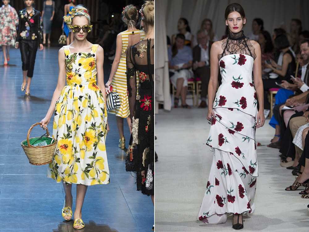 Естественно, лидирующие позиции занимают цветы и другая растительность. На показах были представлены белые розы, ветки сакуры и маленькие ромашки. Выглядят такие варианты красиво и празднично, даже если это обычный сарафан.