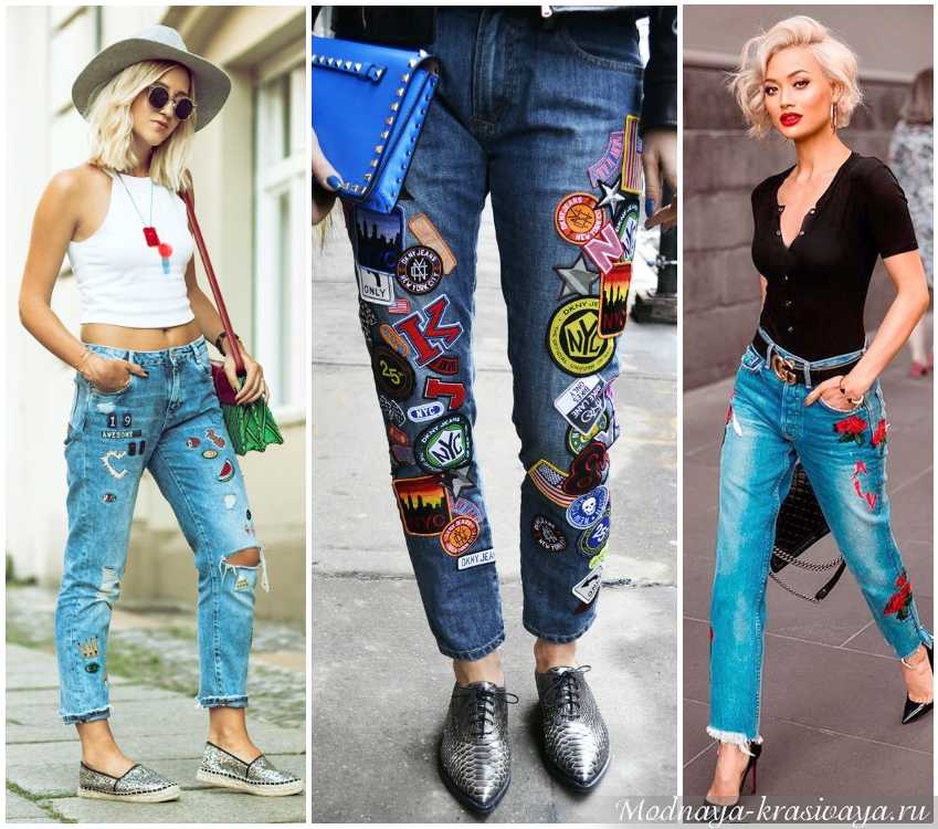 Стильно смотрятся джинсы, комбинированные с другими фактурами, текстурами и оттенками. Модный декор 2018 года — шнуровка, которая может быть выполнена из текстильных материалов, кожи и денима, в тренде нашивки, лампасы, напыление, аппликации из вышивки, патчи из денима, пайеток, рисунки, кружевные вставки, бахрома, дыры.