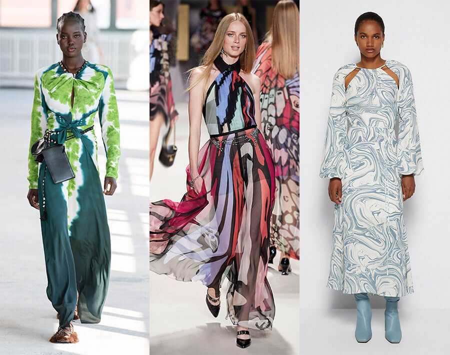 Абстракция, разводы, батик красиво и красочно смотрятся на летящих, струящихся платьях.