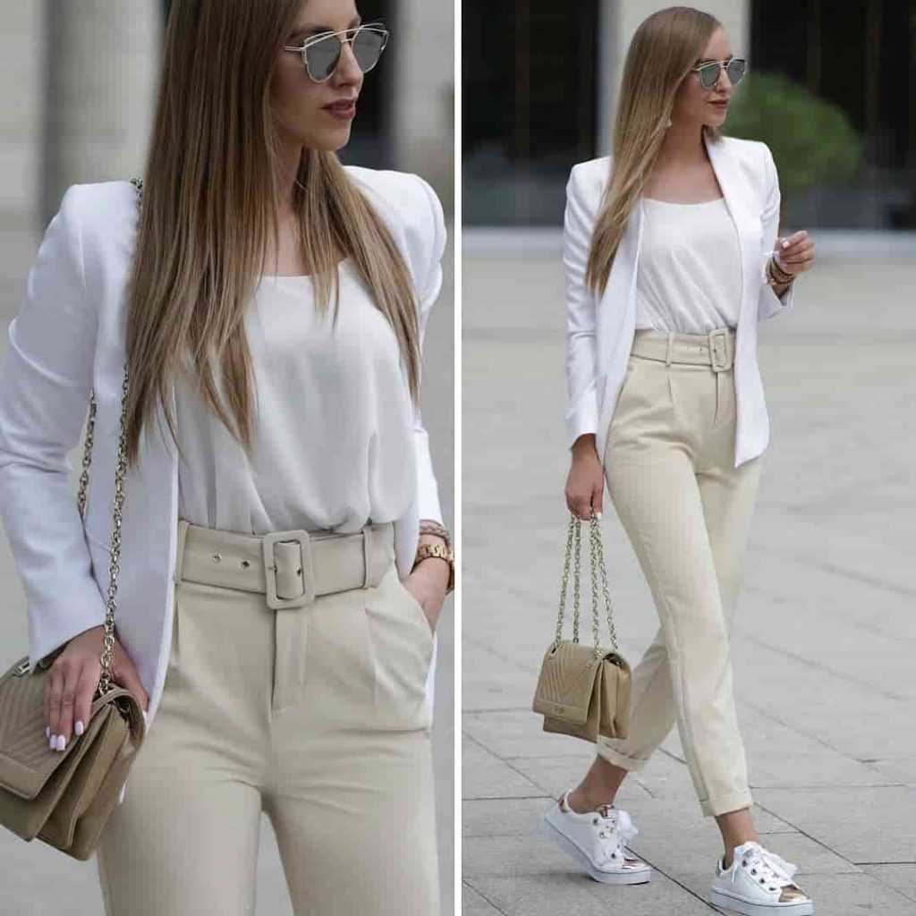 В Инстаграм красиво и сексуально смотрятся образы, где пиджак надет на голое тело. Но в жизни это не всегда практично, а в офисе вовсе недопустимо. Поэтому под низ лучше подобрать первый слой, подходящий по стилю. Примеры удачных сочетаний: