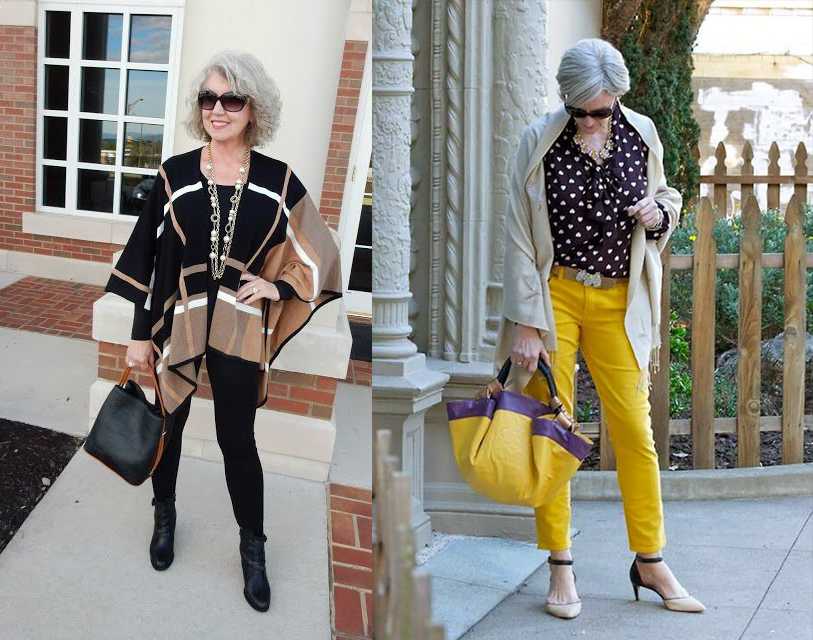 Цветовая гамма должна быть выдержана в нейтральных тонах либо с участием максимум 1-2 ярких вещей. Брюки, джинсы, юбки миди, платья-рубашки, туники — гардероб в 60 лет допускает разные виды одежды. Многослойные образы с толстовками, жакетами, пальто и длинными юбками спортивного стиля смотрятся гармонично на женщинах элегантного возраста.