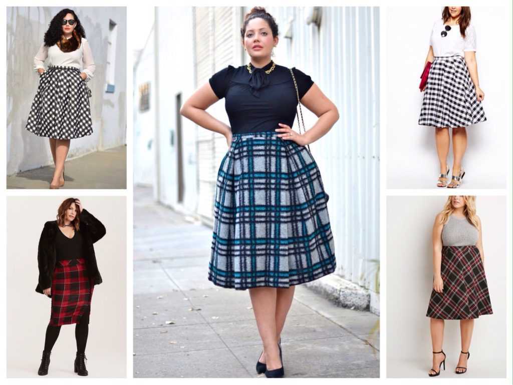 При выборе одежды на полную фигуру огромное значение имеет расцветка и рисунок – не стоит приобретать очень яркие и броские модели, или с крупным рисунком. Лучше отдать предпочтение спокойным тонам. Лучшим решением станут однотонные модели или юбка-солнце клеш в клетку. Оптимальным вариантом длины для полной фигуры является нейтральная миди