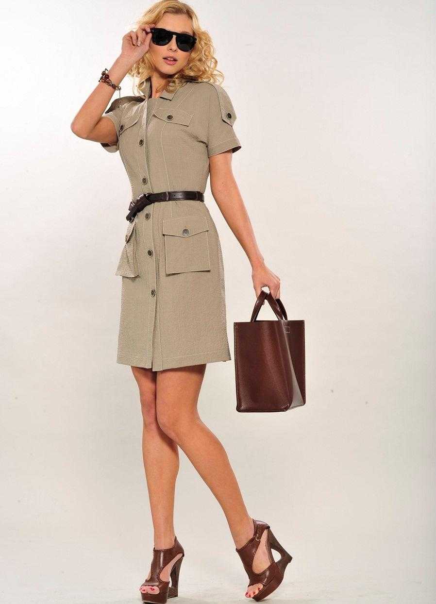 Обычно дизайнеры выбирают натуральные ткани для платья-сафари. Классический вариант — хлопок и лен, потому что они удобны в носке летом. Если девушке хочется выделиться, можно выбрать кожзам. Обычно его используют для создания вставок.