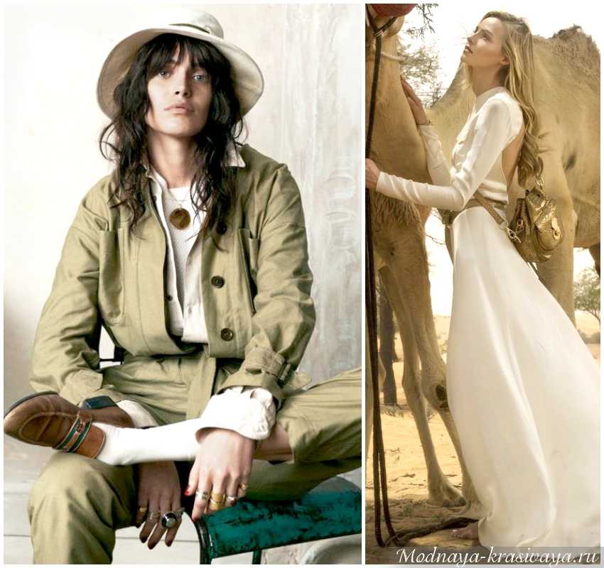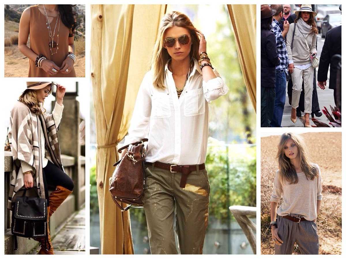 Сафари – довольно строгий стиль. Он представляет собой именно то, что по обыкновению рекомендуют мамы носить в городской среде своим дочерям, но с элементами экзотики. Стиль сафари прекрасно уживается в одном образе с другими модными стилями. Если у вас есть какой-то потрясающий сувенир из южного путешествия, например африканское ожерелье или индийские пышные браслеты, то обязательно используйте его при создании образа в стиле сафари. Все украшения в таком духе примечательно вписываются в стиль сафари. В стиле сафари доминирует коричневая кожа. Хорошо вписываются всевозможные эффектные элементы 70-х годов, например, бахрома. Но в таком проявлении стиль сафари считается уже более нарядным и праздничным.