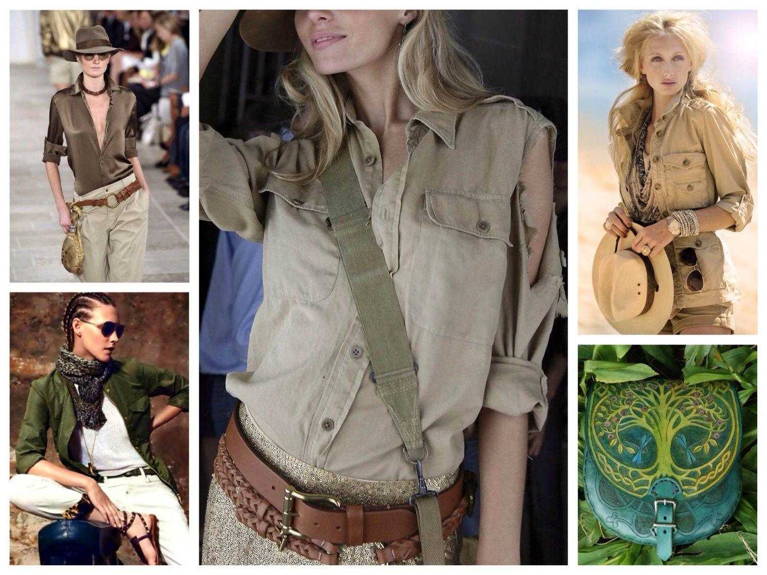 Одежда в «африканском» стиле изобилует накладными карманами, широкими ремнями с крупными пряжками, шнуровкой, металлическими пуговицами и т.д.