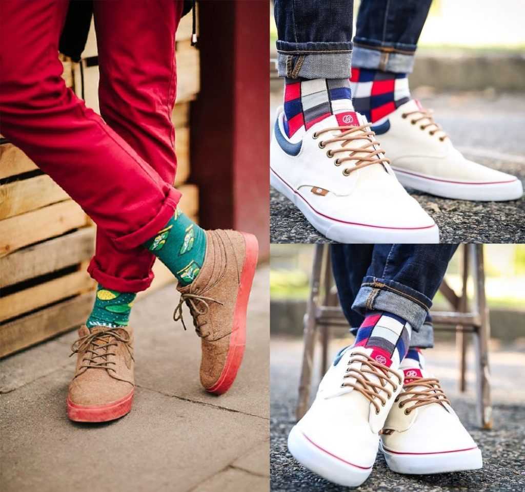 - Цветные, с принтом – лучше надевать под стиль кэжуал. Оттенок одежды может быть разный: от монохромного, строгого до разнообразного. Но нужно учесть деталь такого же цвета, как и принт на кедах.