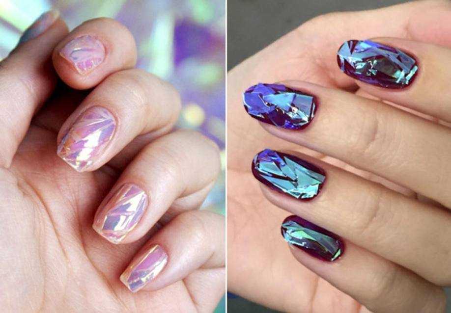 Еще одним популярным трендом будущей зимы, способным идеально дополнить праздничный образ, является стеклянный арт-дизайн с голографическим эффектом. Суть такого маникюра состоит в том, чтобы создать иллюзию кусочков цветного битого стекла на поверхности ногтевых пластин.