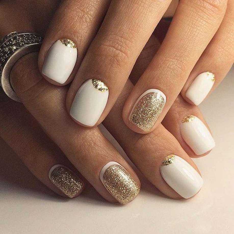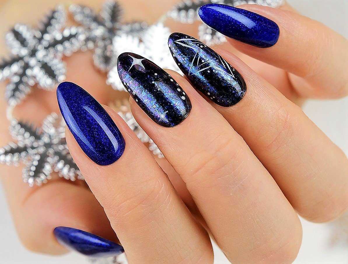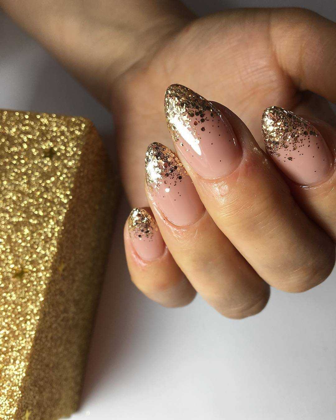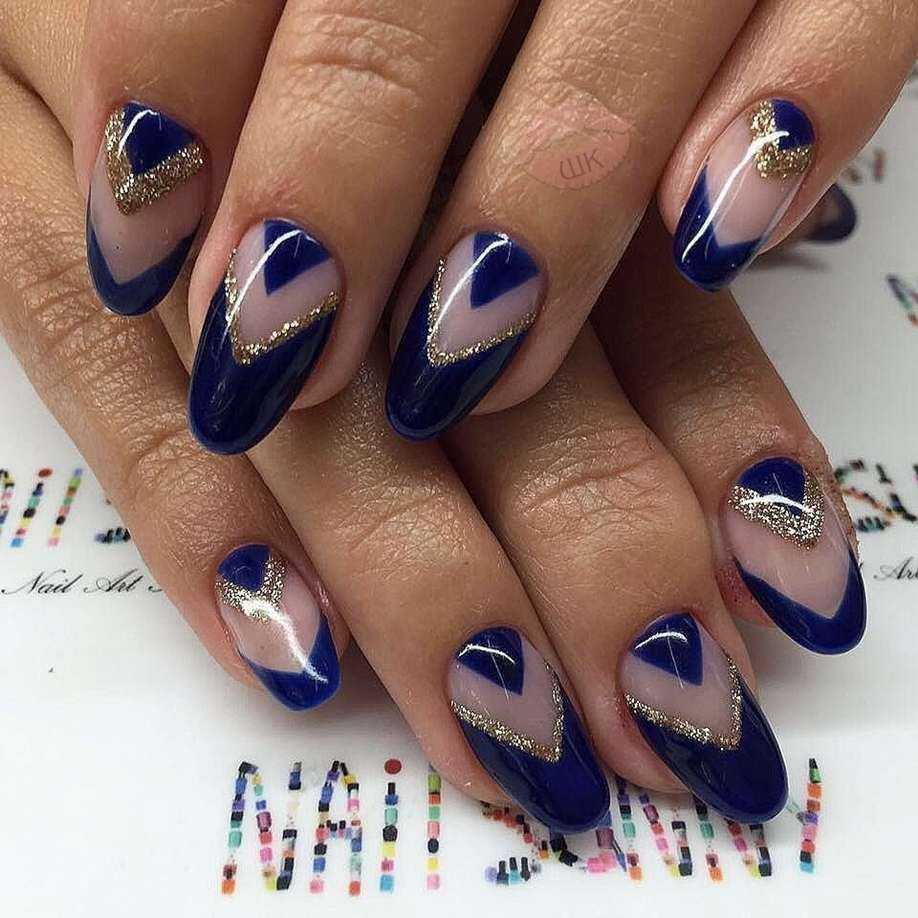 Идей модного маникюра в этом сезоне достаточно много, ведь никто не отменял глиттер, а также его присутствие при моделировании разных форм улыбки. Необыкновенно смотрится ансамбль темно-синего и золотого, где свободный край естественно окрашен синим.