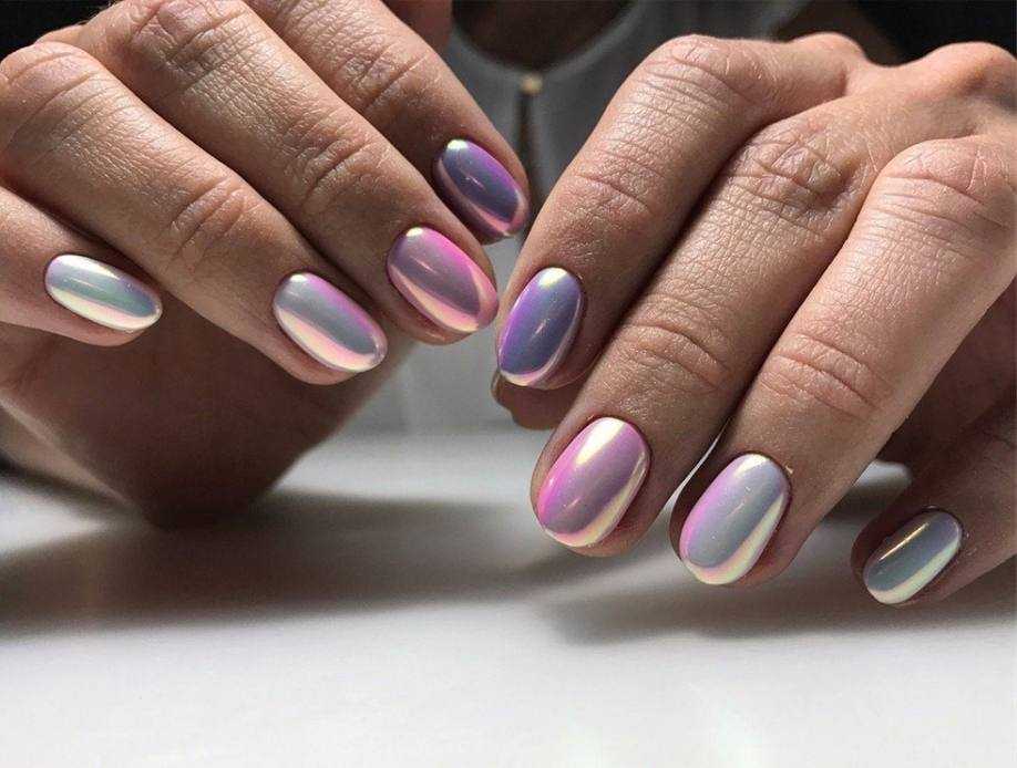 Если посмотреть на короткие ногти, представленные на фото, то можно увидеть дизайн, выполненный фольгой. Зеркальная пленка буквально растворилась на кончике пальца. Она выглядит потрясающе, словно погруженная под слои полимера. Расположение узора происходит только на одном из пальцев, образуя единую, гармоничную композицию.