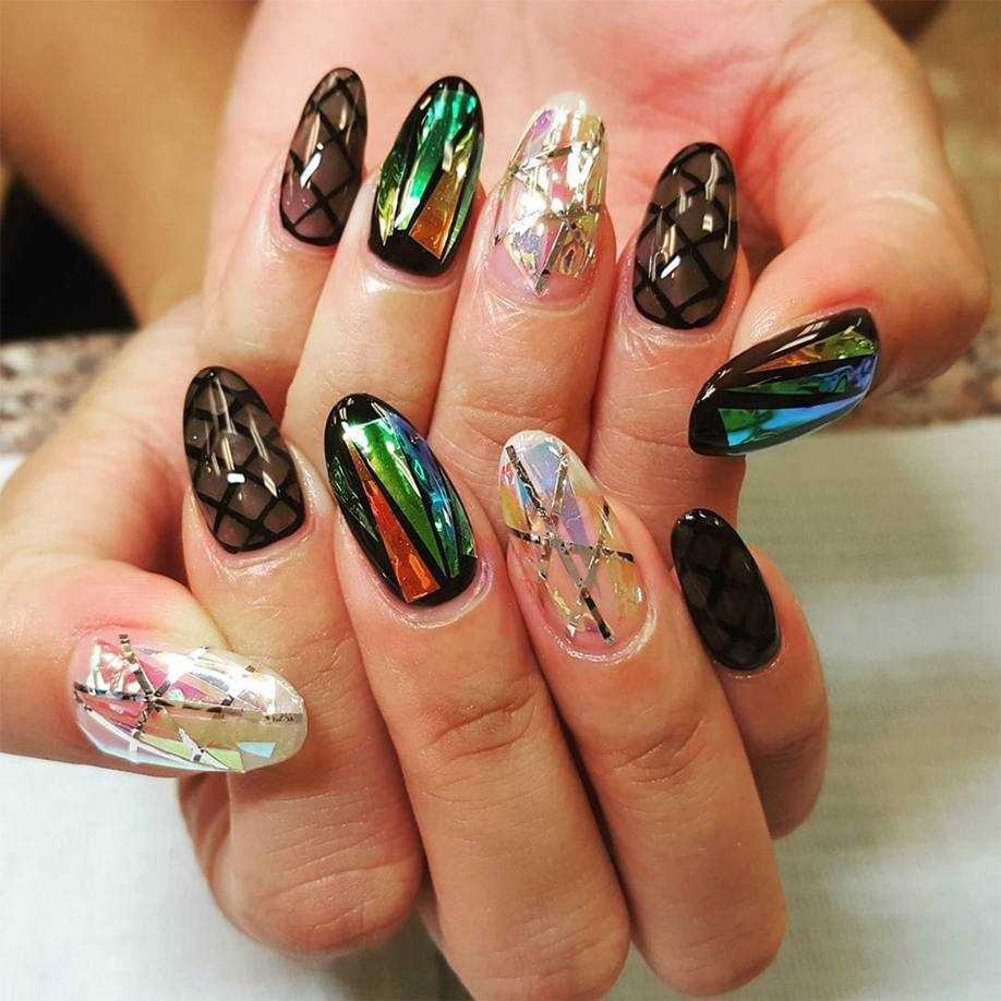Лучи света, попадающие на стеклянный маникюр, заставляют его переливаться множеством разных оттенков. Этот эффект достигается при помощи кусочков голографической фольги и специальных наклеек.