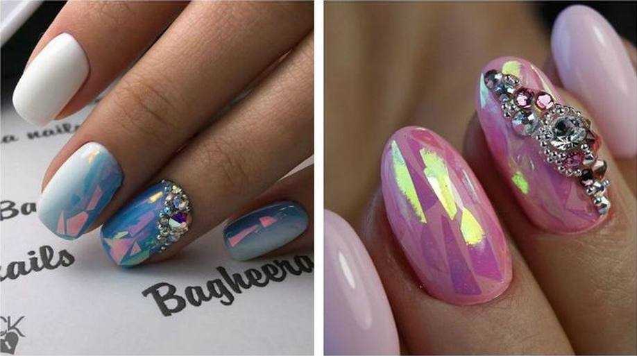 Эффект битого стекла можно создать на каждом ноготке, а можно ограничиться акцентом, выполненным на одном или двух пальцах, покрыв ногтевые пластинки остальных лаком идентичного тона или прибегнув к другому арт-дизайну.