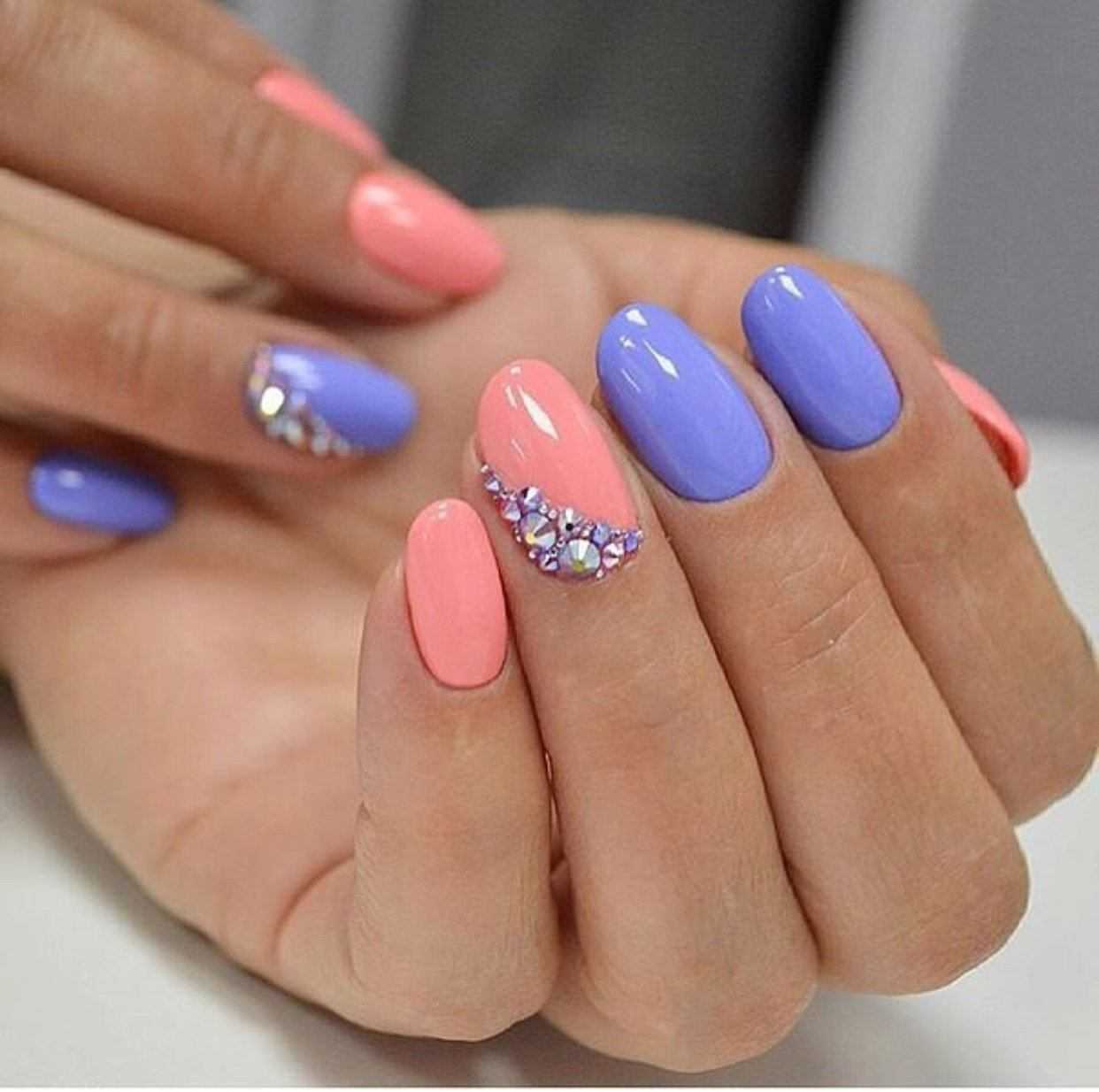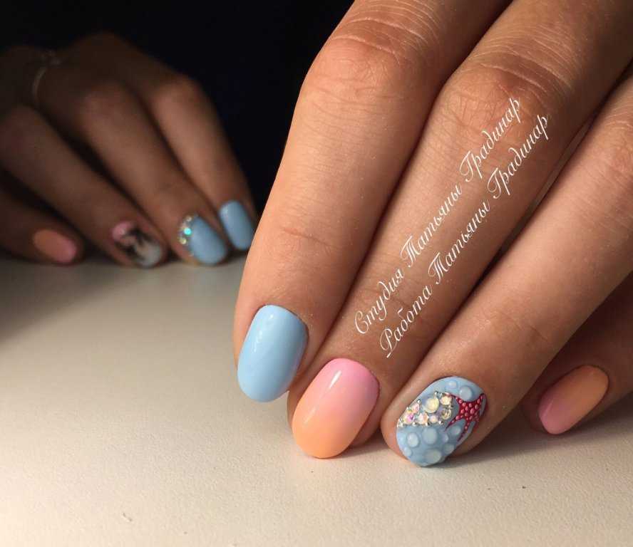 Возможно выполнение одноцветного лаконичного дизайна либо использование какого-либо дополнения для двух пальцев. В летнее время на таких ногтях неплохо выглядят любые рисунки «отпускной» тематики, абстрактные узоры, стемпинг.