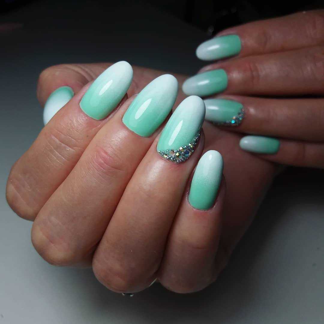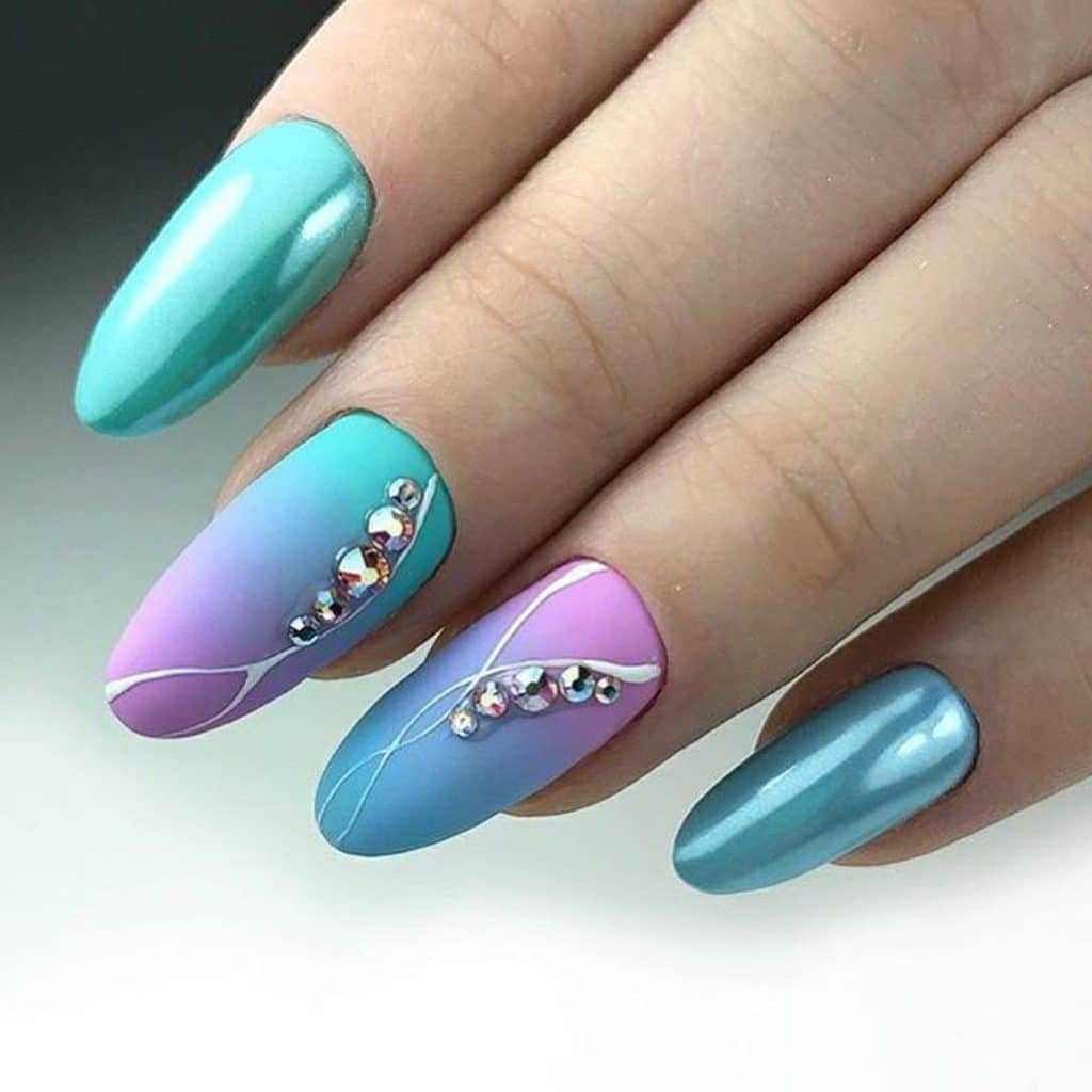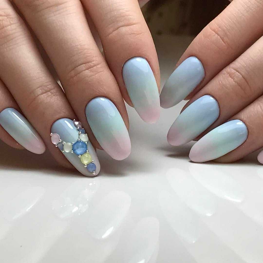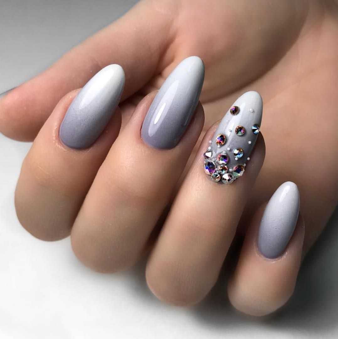 Для него характерен полноценный и супермодный вид. Плавные переходы между разными оттенками кажутся весьма оригинальными. Ноготки декорируют камушками и стразами.