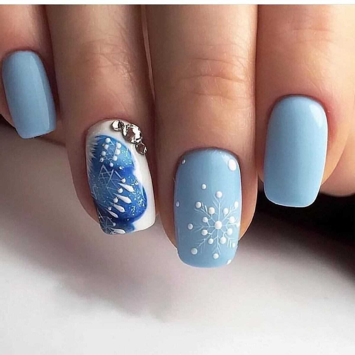 Светло-голубой — один из лучших цветов для зимнего маникюра. Зимой, также не лишними в дизайне будет серебро, золото, стразы и камушки, металлизированные материалы, глиттер, камифубуки.