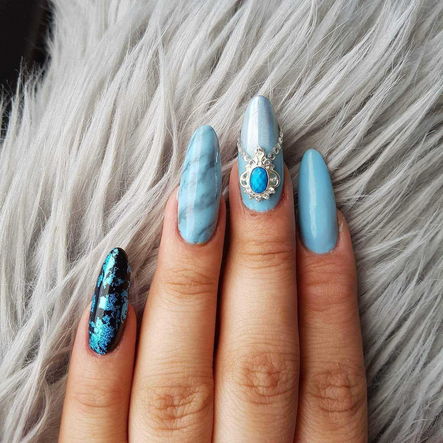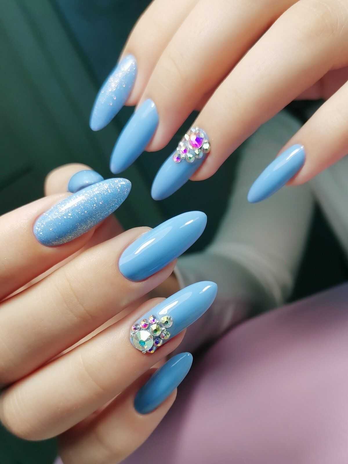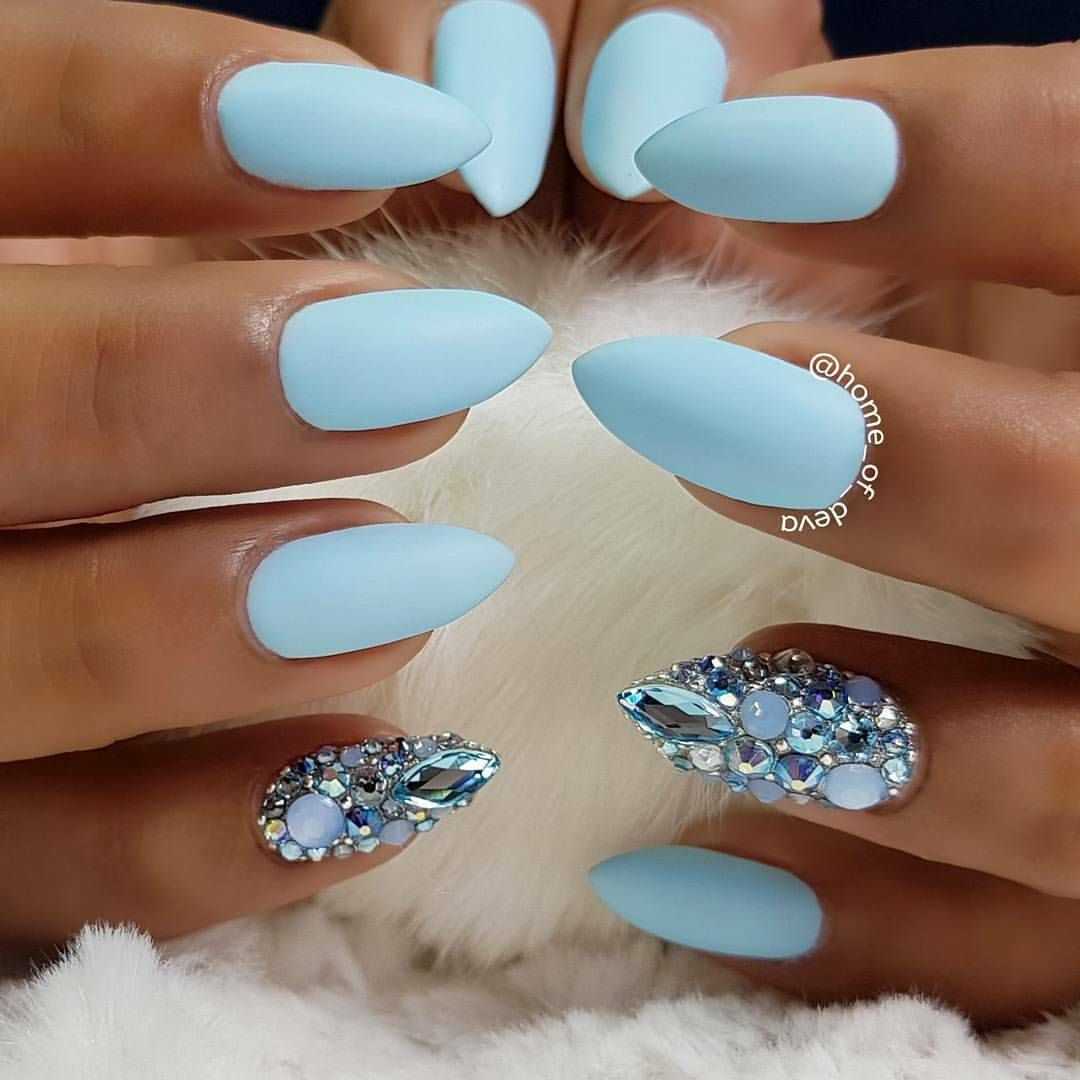 Голубой нежный цвет ногтей, сочетающийся с привлекательными стразами, имеет поразительный вид. Можно выбрать симпатичные пикси приятного оттенка, способные заиграть яркими красками, сочетаясь с россыпью камней над голубыми покрытиями разных оттенков.