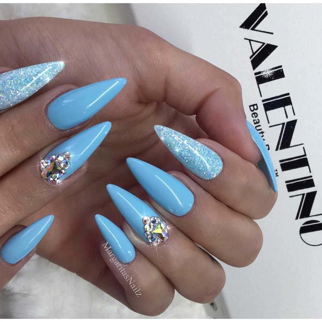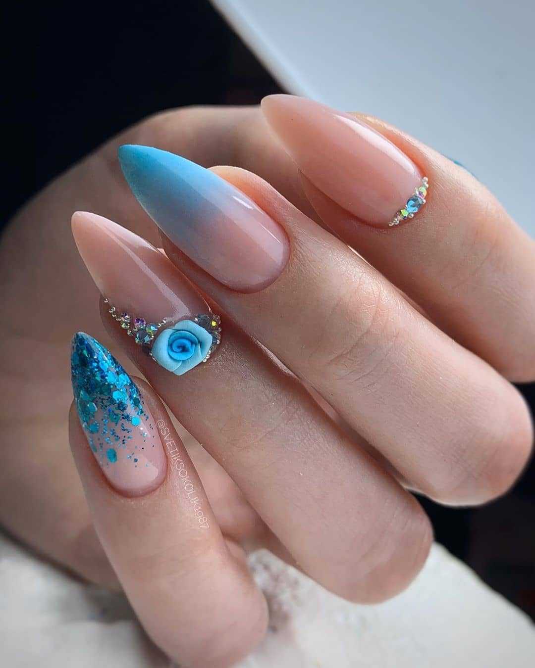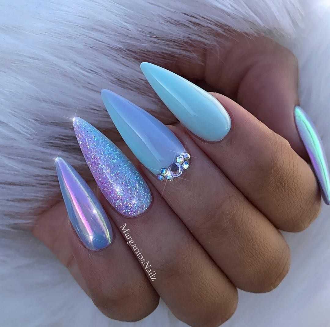 Голубой нежный цвет ногтей, сочетающийся с привлекательными стразами, имеет поразительный вид. Можно выбрать симпатичные пикси приятного оттенка, способные заиграть яркими красками, сочетаясь с россыпью камней над голубыми покрытиями разных оттенков.