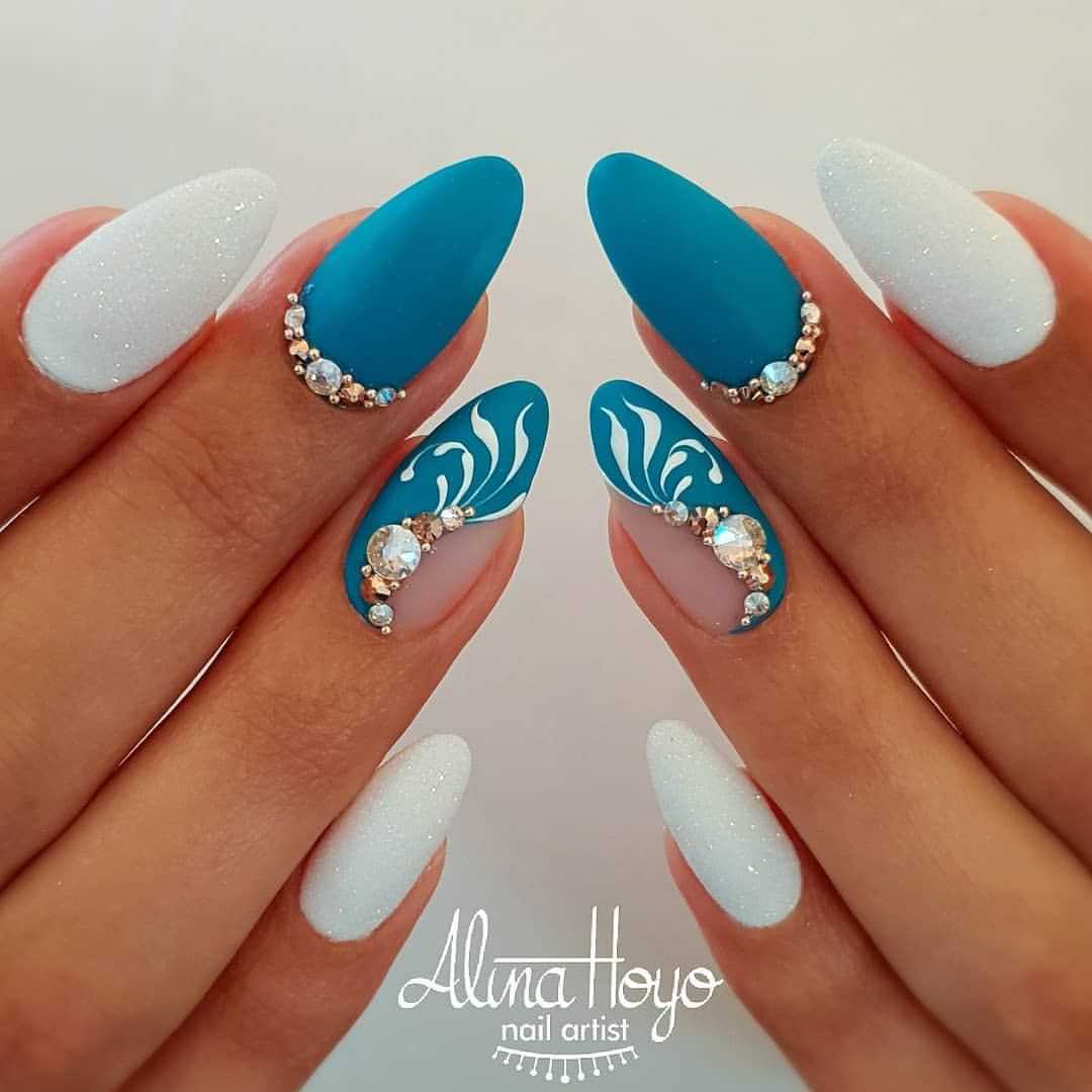 Рассматривая новые тенденции этого года, самая яркая и восхитительная идея – это сочетание голубого и белого цвета. Чаще всего белый тон используется в качестве акцента или основы для нанесения голубых рисунков. Необычно и привлекательно выглядит выполнение абстрактных рисунков в данном цветовом решении, особенно если сделать его в матовом топе.