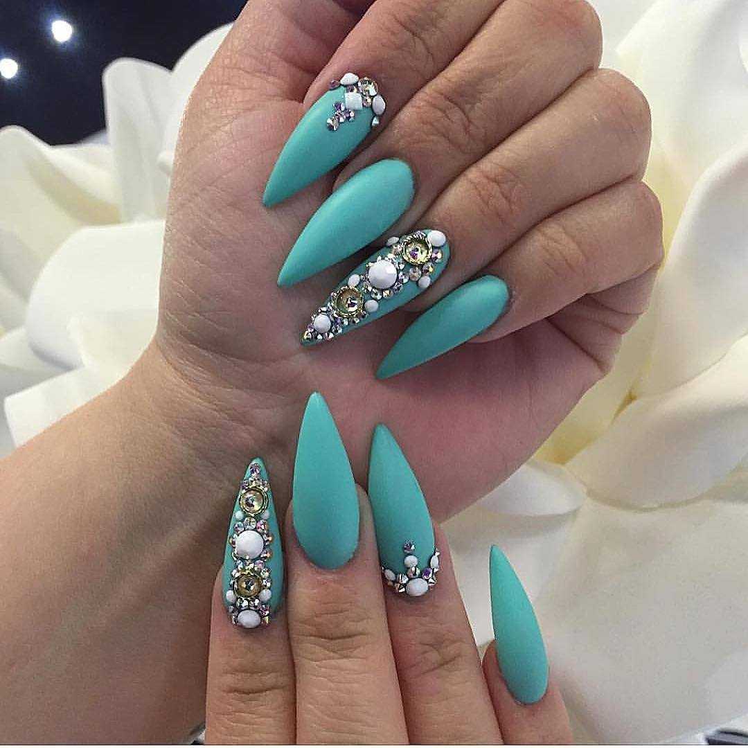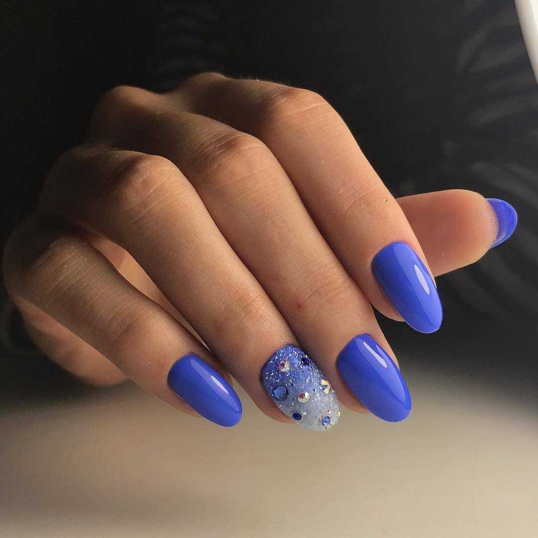 Для ногтей большой длины подходит равномерный тон, который может быть бледно-голубым либо ярким, интенсивным, вызывающим внимание. Сейчас в тренде миндалевидные ногти