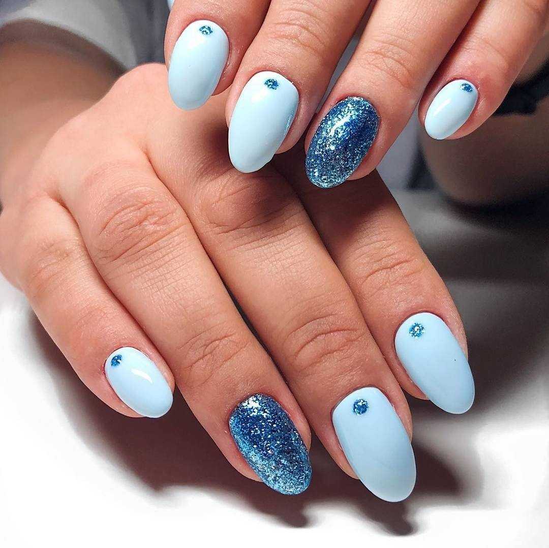 С помощью стильного маникюра голубого цвета, который имеет дополнительное украшение в виде блёсток, создаётся яркий имидж даже в случае одноцветного покрытия.