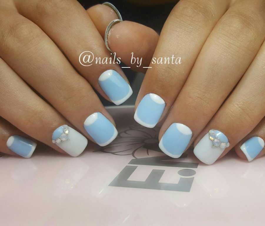 Сочетание белого и голубого выглядит еще нежнее и женственнее, чем однотонные нейл-арты. Такой маникюр отлично выглядит в градиенте, во французском дизайне, в маникюре с белым декором на голубом фоне.