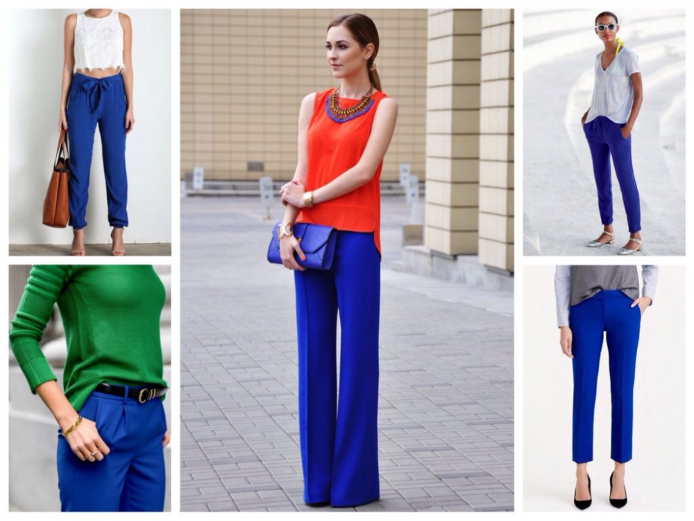 Цвета могут быть различными. Для делового образа стоит подобрать брюки темного оттенка. Для других случаев будут уместны ярко-синие изделия с рисунком. Создать оригинальный лук поможет модель в клетку.