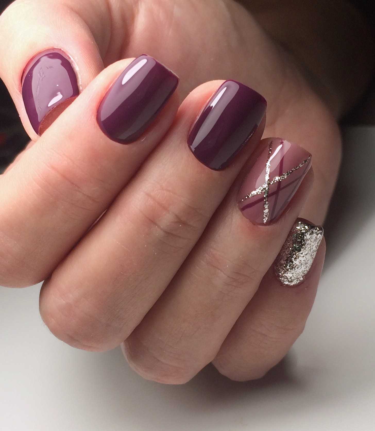 Глиттерные нотки — металлизированные и цветные, также входят в вечерний, праздничный, комбинированный сиреневый дизайн ногтей 2020-2021